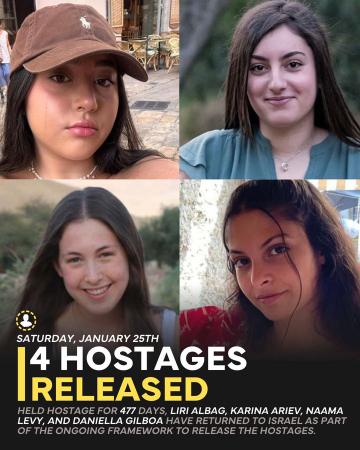 Pada Sabtu (25/1) Hamas melepas 4 tentara wanita Israel yang dilakukan secara prosedural, menandatangani surat pembebasan dan menyerahkannya kepada pihak palang merah internasional untuk dikembalikan ke keluarganya masing-masing. Mereka adalah, Karina Araiv, Daniella Gilboa, Naama Levy, Liri Albag.